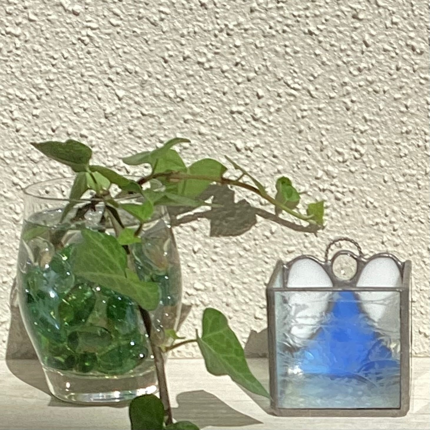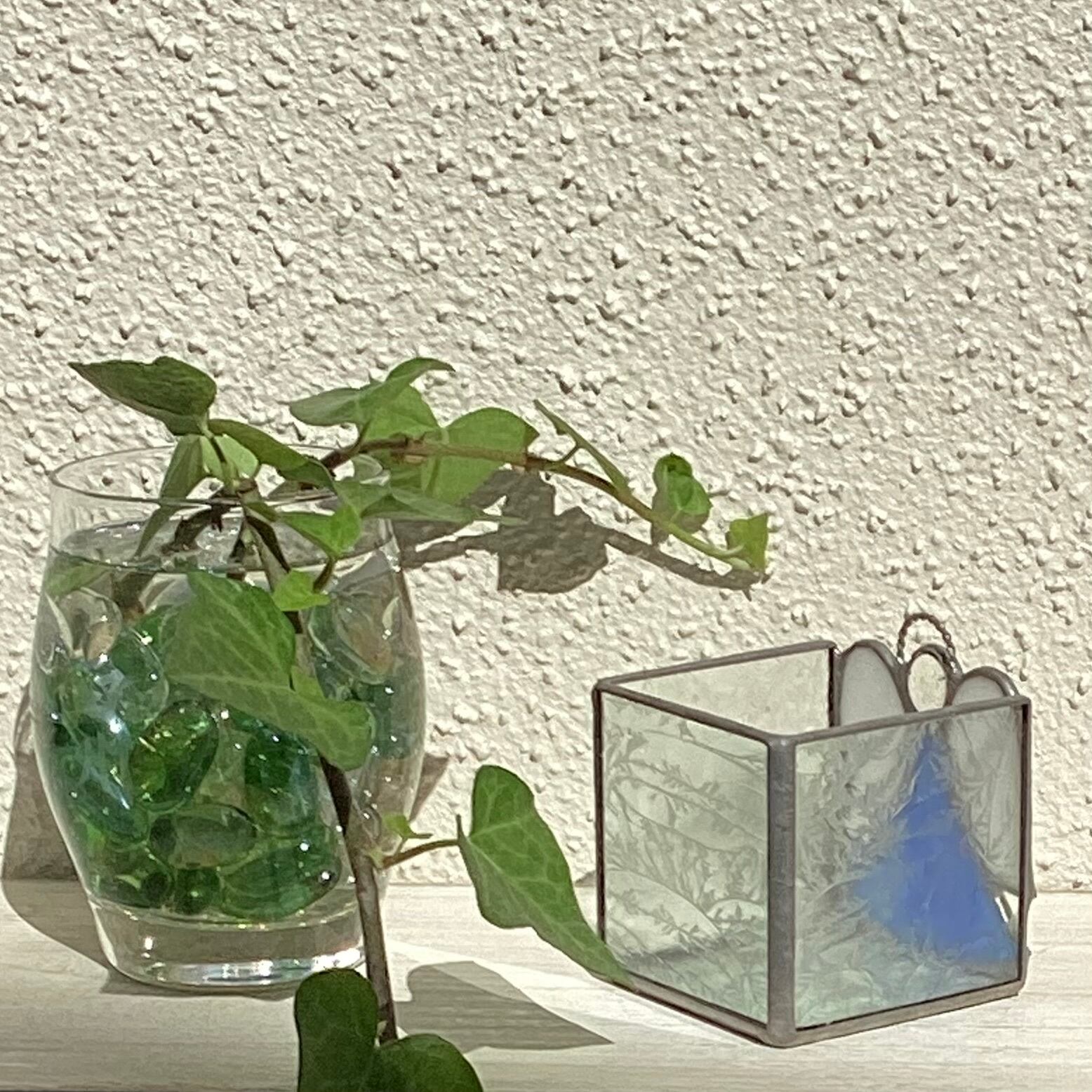 天使の可愛いキャンドルホルダーです。天使の羽はイリディセントガラス、見る角度によって虹色に見えます。側面と底のガラスは結晶柄ガラスです。小物入れとして使っても、飾っておくだけでも可愛いです。お部屋のどこかで天使が優しく見ていてくれそうです。